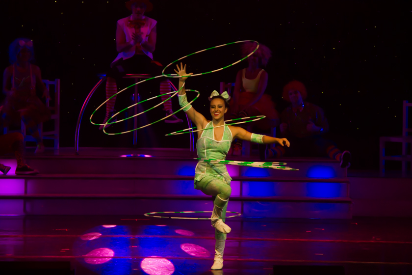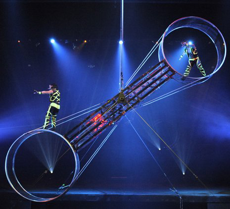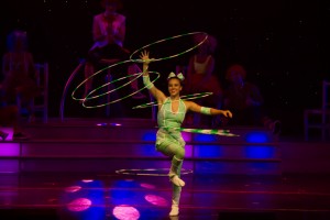 The full cast opening featuring dancing and music performed by colorfully dressed “clowns” is a fast paced number filled with neat acrobatics and moves that blends into one of best “hula hoop” acts I have ever seen. Young Noemi Lee España does amazing things with hula hoops that I have never seen before. Oh I have seen plenty of hula hoop acts and people twirl ten hoops before but I have never seen a hula hoop act like this and it’s just the first act.